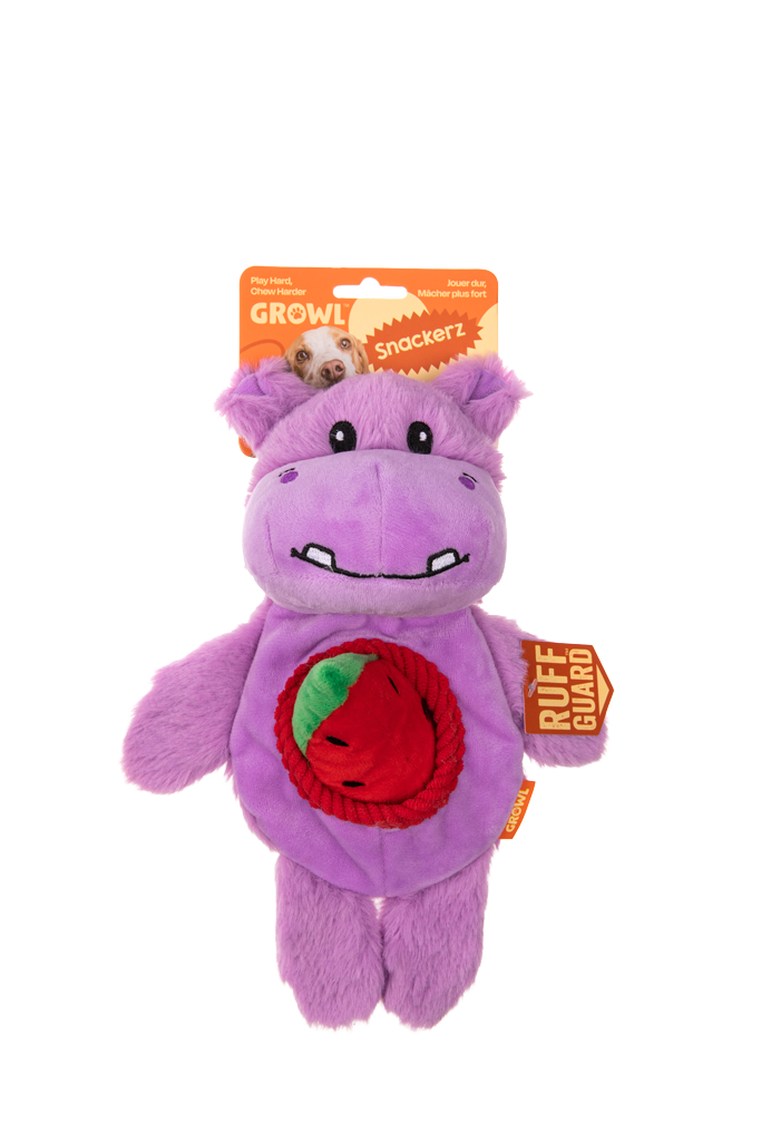 Die Growl Snackerz verbinden weichen Plüsch mit einem überraschenden interaktiven Snack-Spielzeug. Jedes Snackerz-Spielzeug enthält einen großen Quietscher und ein verstecktes Snack-Spielzeug, z. B. Karotte, Wassermelone oder Banane, mit eigenem Quietscher. Dieses Design regt Hunde zum Graben, Entdecken und Spielen an und nutzt das Snack-Spielzeug dauerhaft.